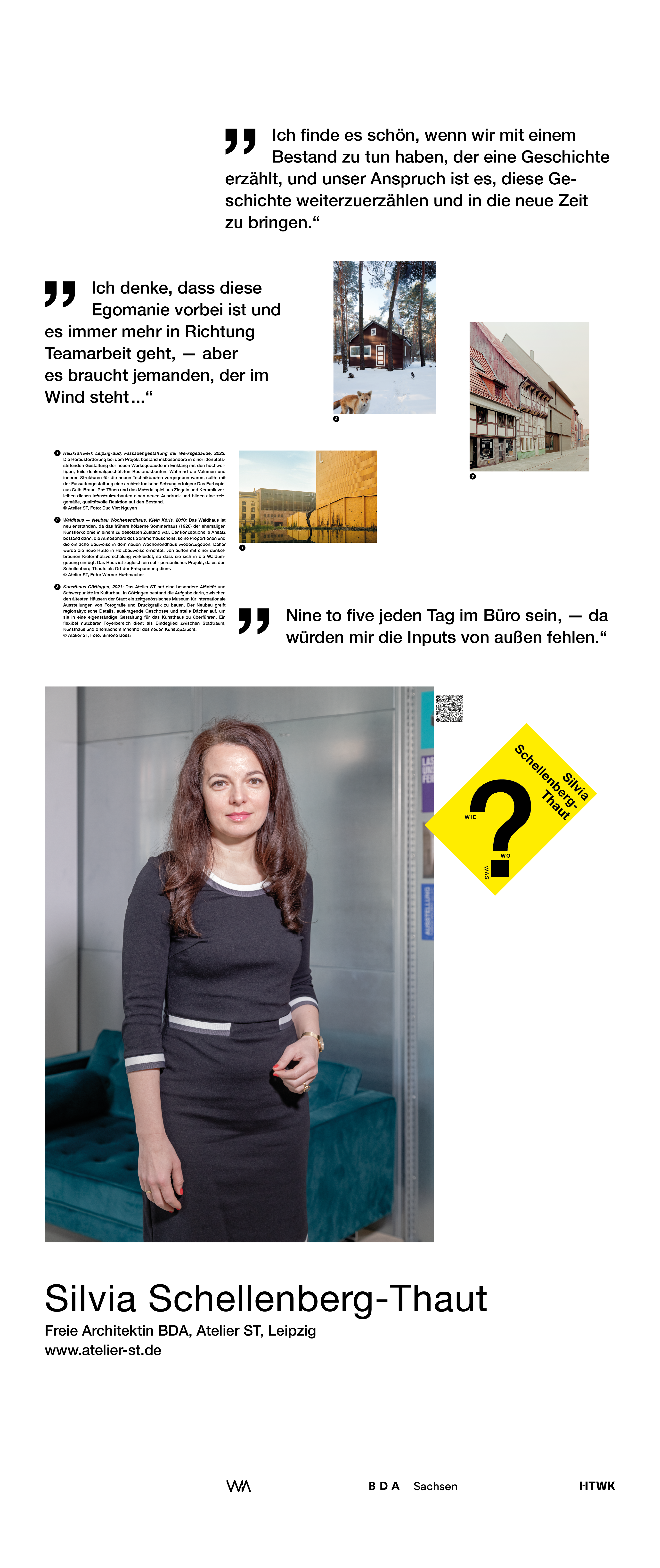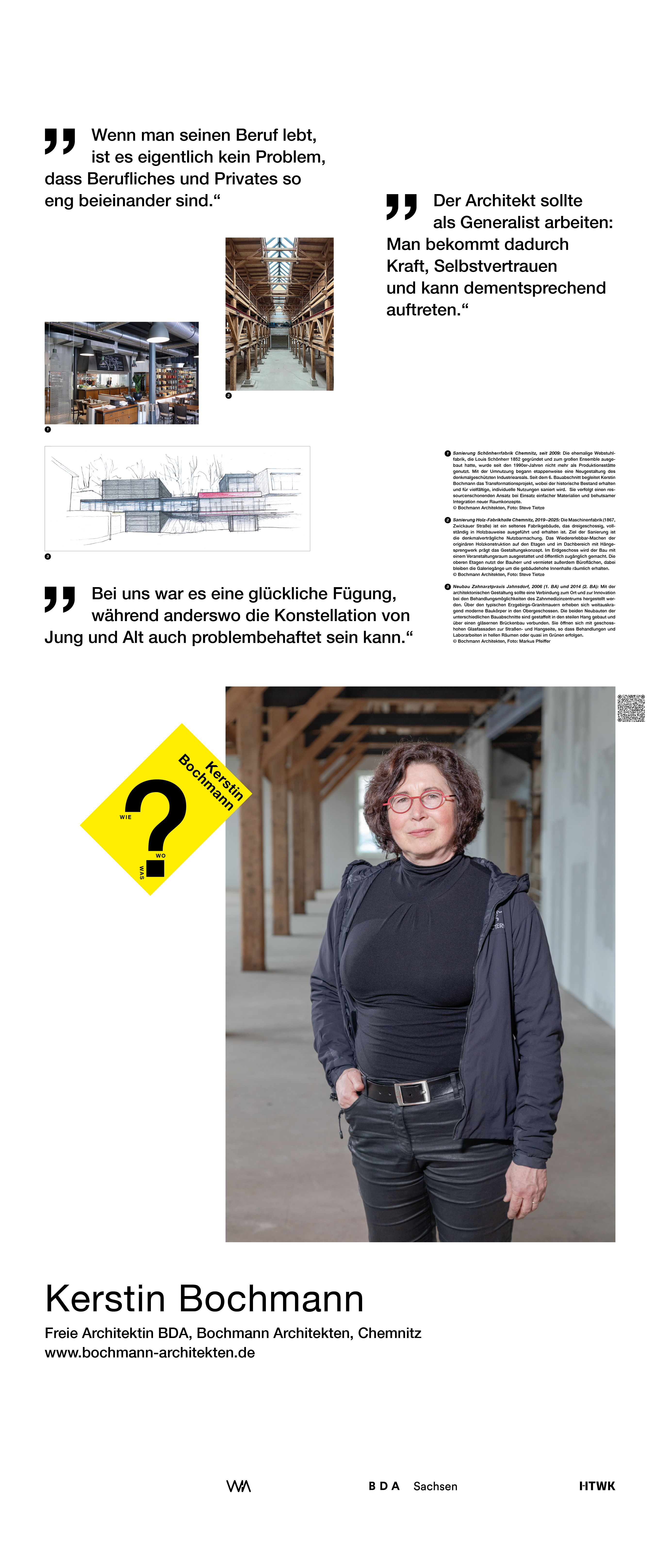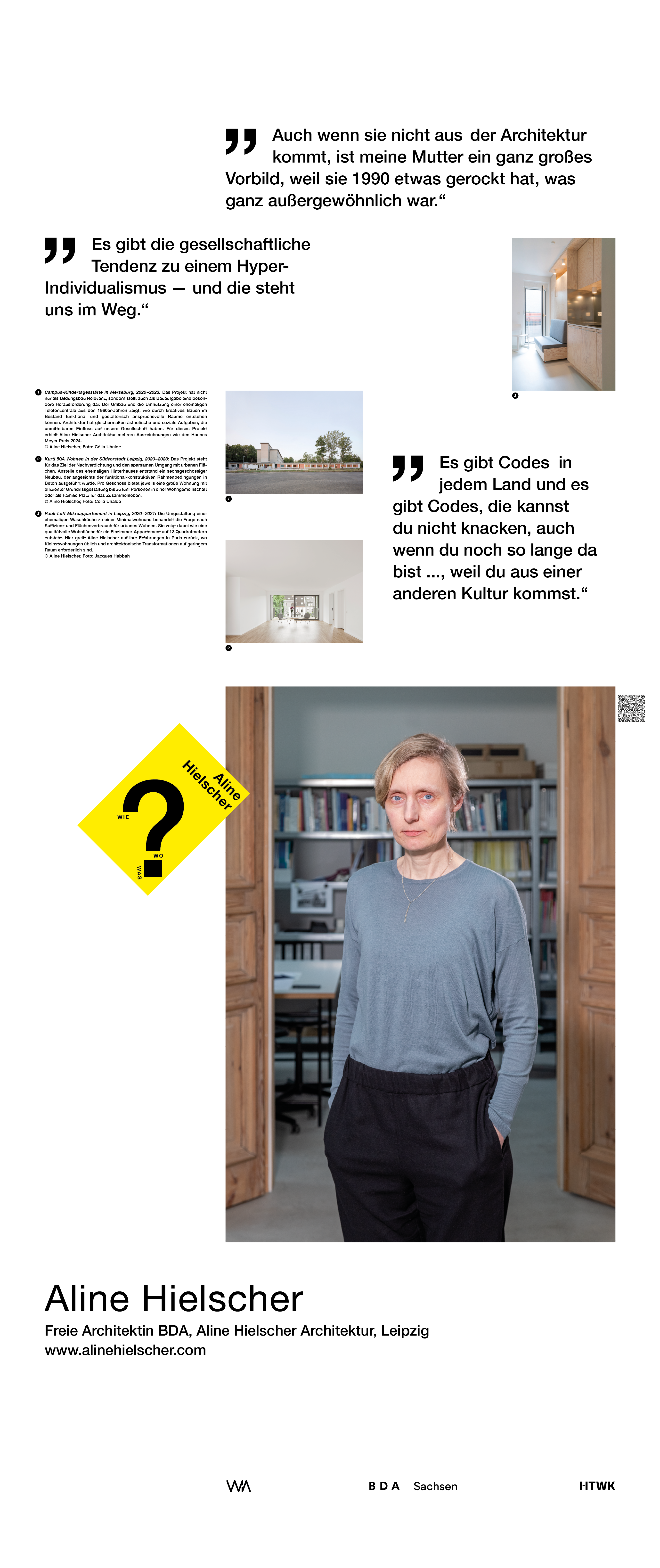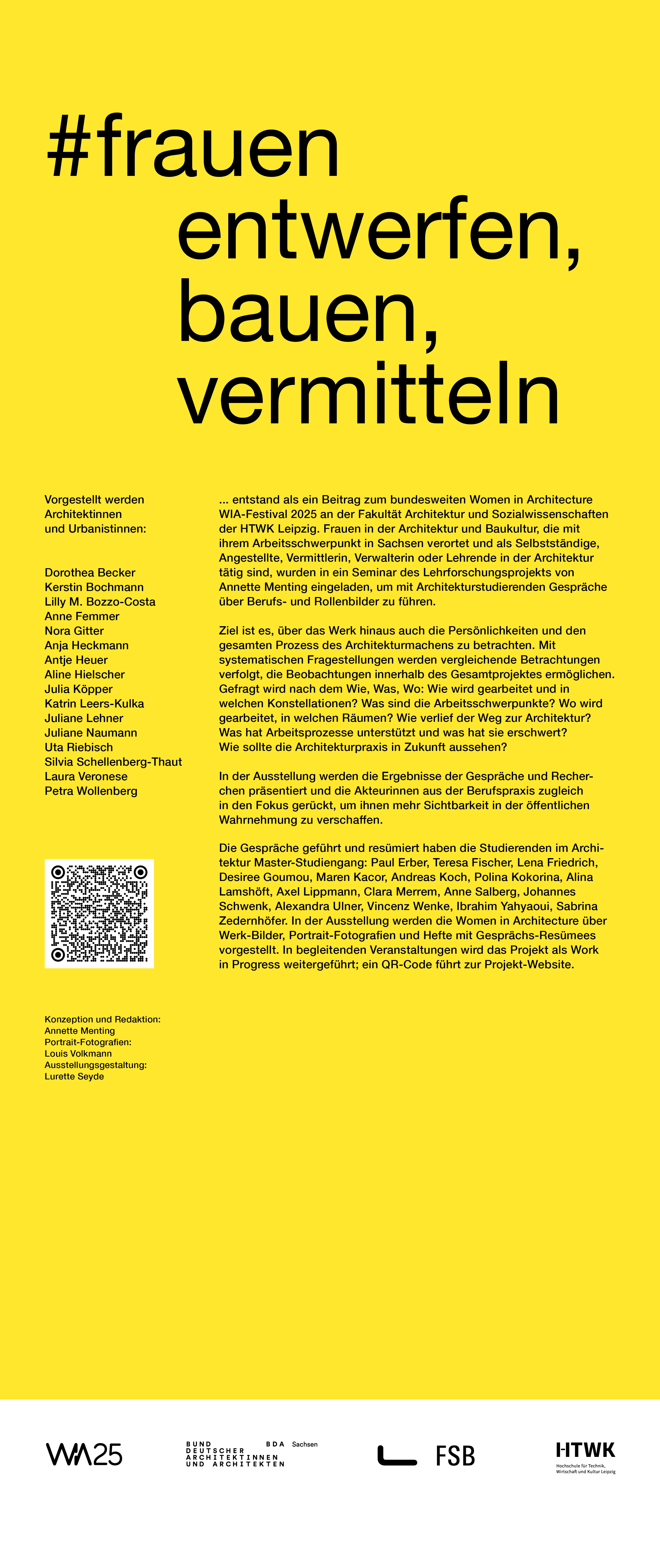 Die Ausstellung entstand als ein Beitrag zum bundesweiten Women in Architecture WIA-Festival 2025 an der Fakultät Architektur und Sozialwissenschaften der HTWK Leipzig. Frauen in der Architektur und Baukultur, die mit ihrem Arbeitsschwerpunkt in Sachsen verortet und als Selbstständige, Angestellte, Vermittlerin, Verwalterin oder Lehrende in der Architektur tätig sind, wurden in ein Seminar des Lehrforschungsprojekts von Annette Menting eingeladen, um mit Architekturstudierenden Gespräche über Berufs- und Rollenbilder zu führen.