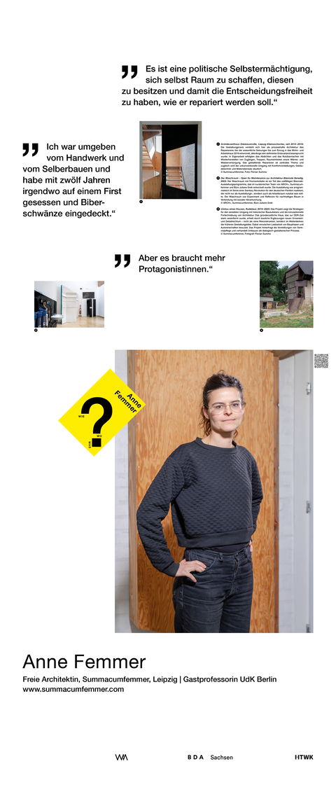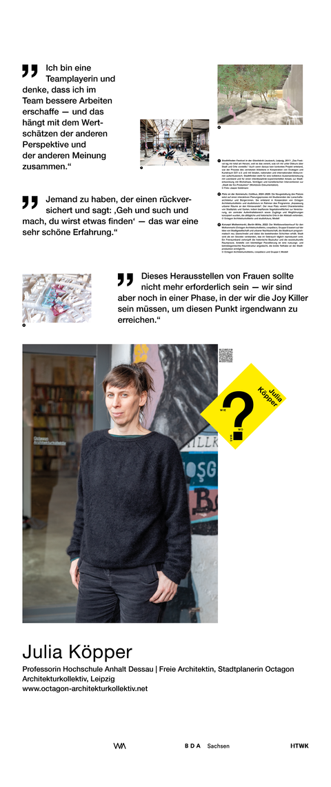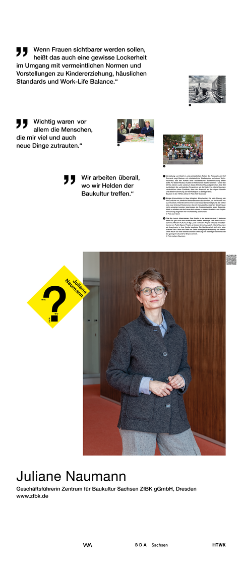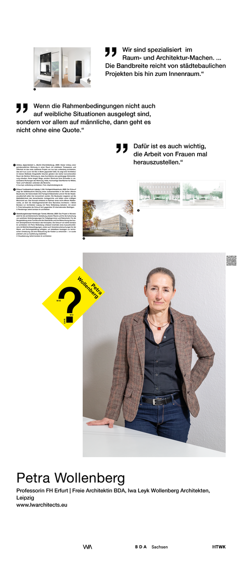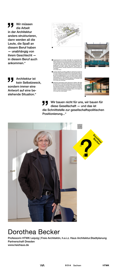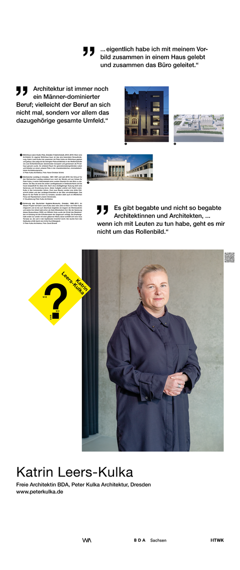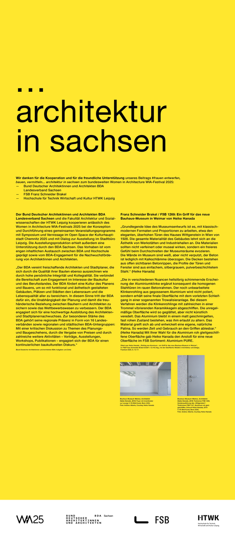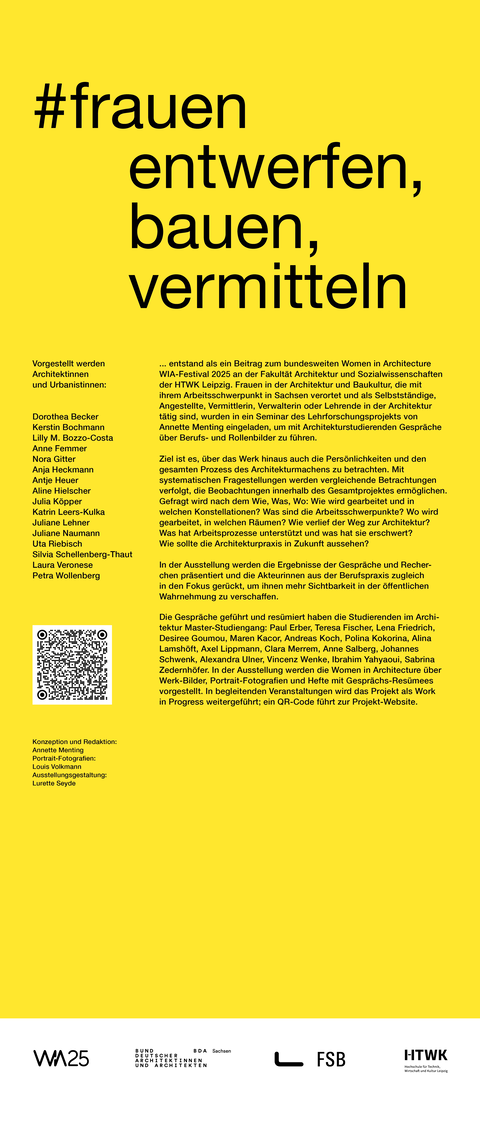Die Ausstellung entstand als ein Beitrag zum bundesweiten Women in Architecture WIA-Festival 2025 an der Fakultät Architektur und Sozialwissenschaften der HTWK Leipzig. Frauen in der Architektur und Baukultur, die mit ihrem Arbeitsschwerpunkt in Sachsen verortet und als Selbstständige, Angestellte, Vermittlerin, Verwalterin oder Lehrende in der Architektur tätig sind, wurden in ein Seminar des Lehrforschungsprojekts von Annette Menting eingeladen, um mit Architekturstudierenden Gespräche über Berufs- und Rollenbilder zu führen.