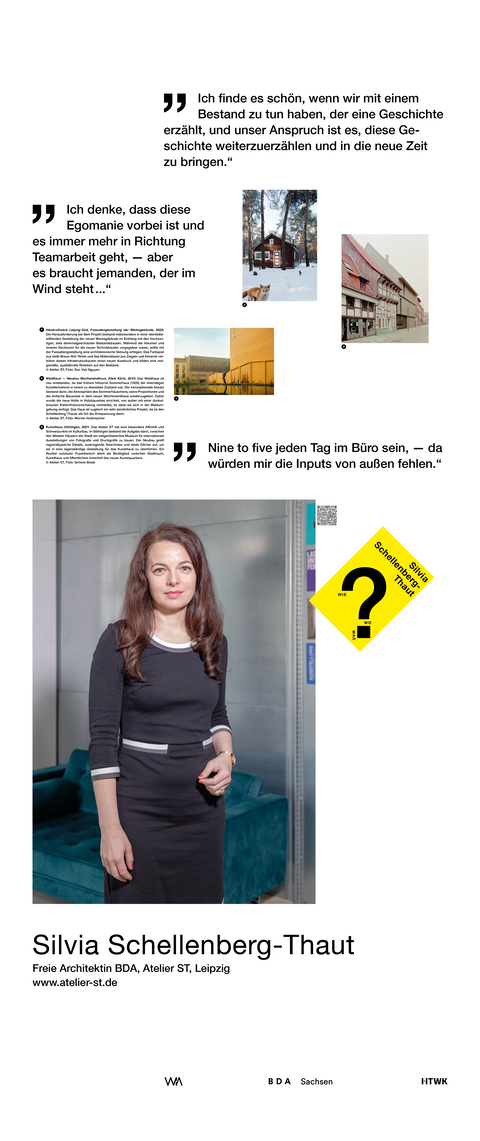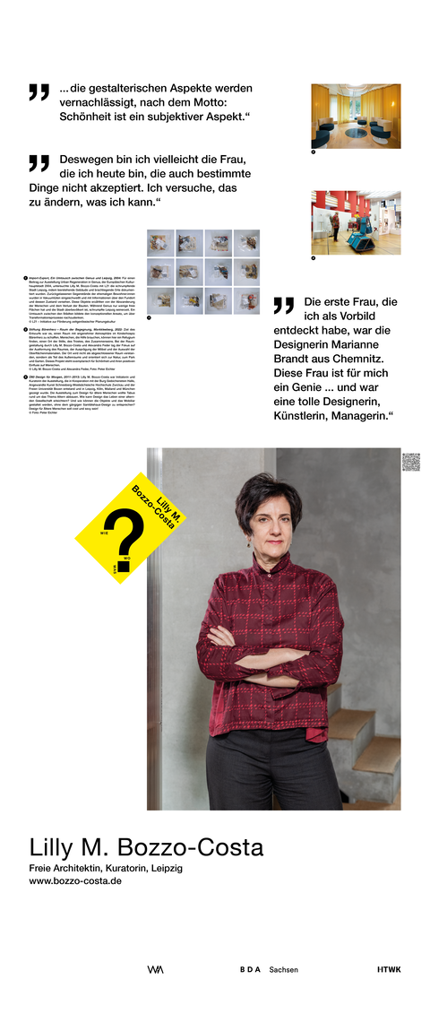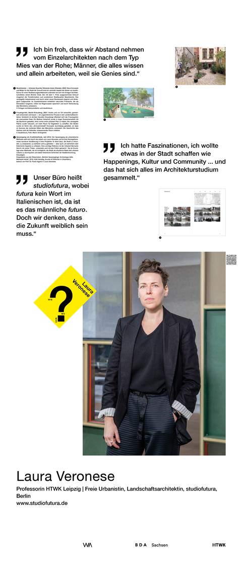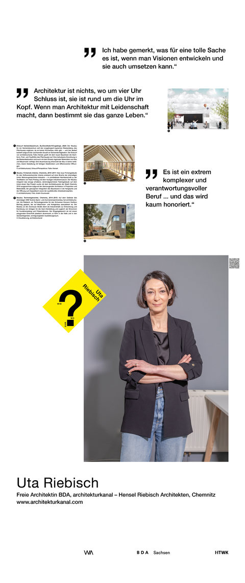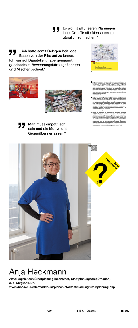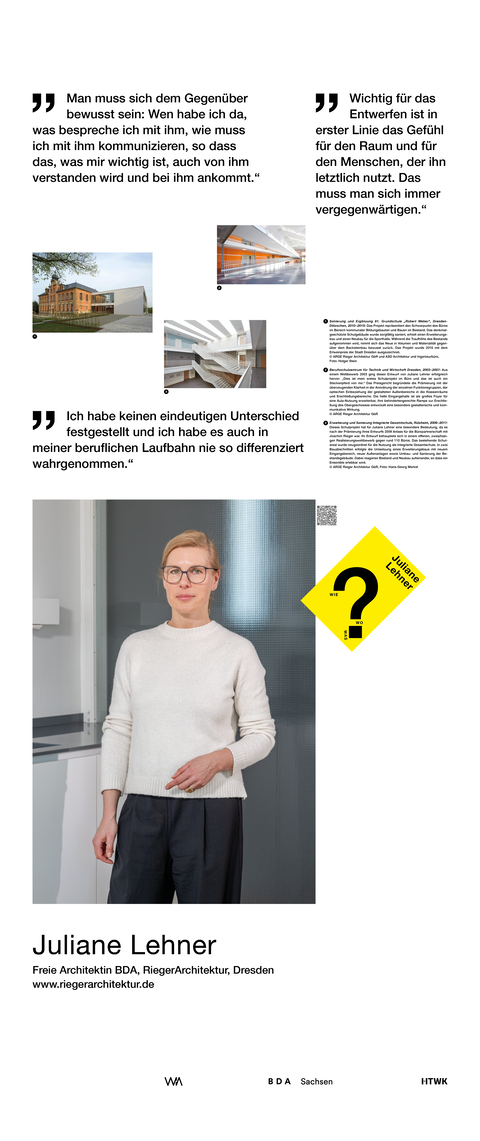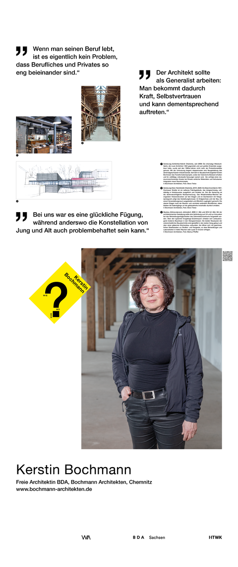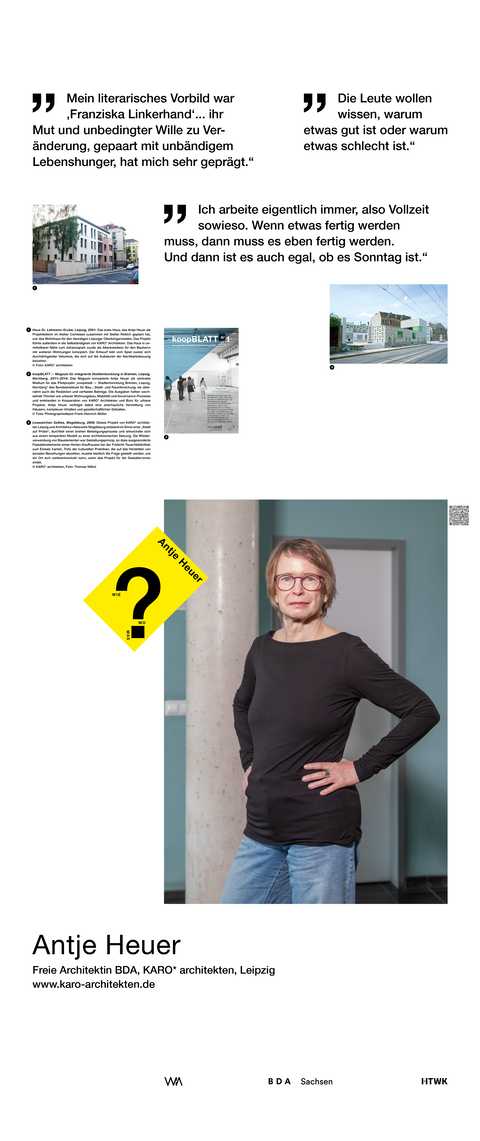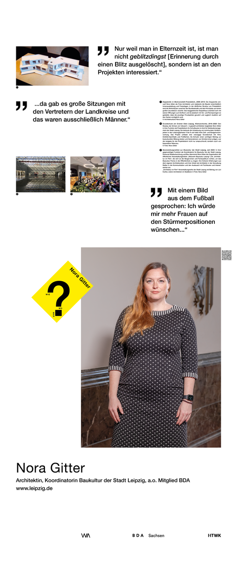 Die Ausstellung entstand als ein Beitrag zum bundesweiten Women in Architecture WIA-Festival 2025 an der Fakultät Architektur und Sozialwissenschaften der HTWK Leipzig. Frauen in der Architektur und Baukultur, die mit ihrem Arbeitsschwerpunkt in Sachsen verortet und als Selbstständige, Angestellte, Vermittlerin, Verwalterin oder Lehrende in der Architektur tätig sind, wurden in ein Seminar des Lehrforschungsprojekts von Annette Menting eingeladen, um mit Architekturstudierenden Gespräche über Berufs- und Rollenbilder zu führen.